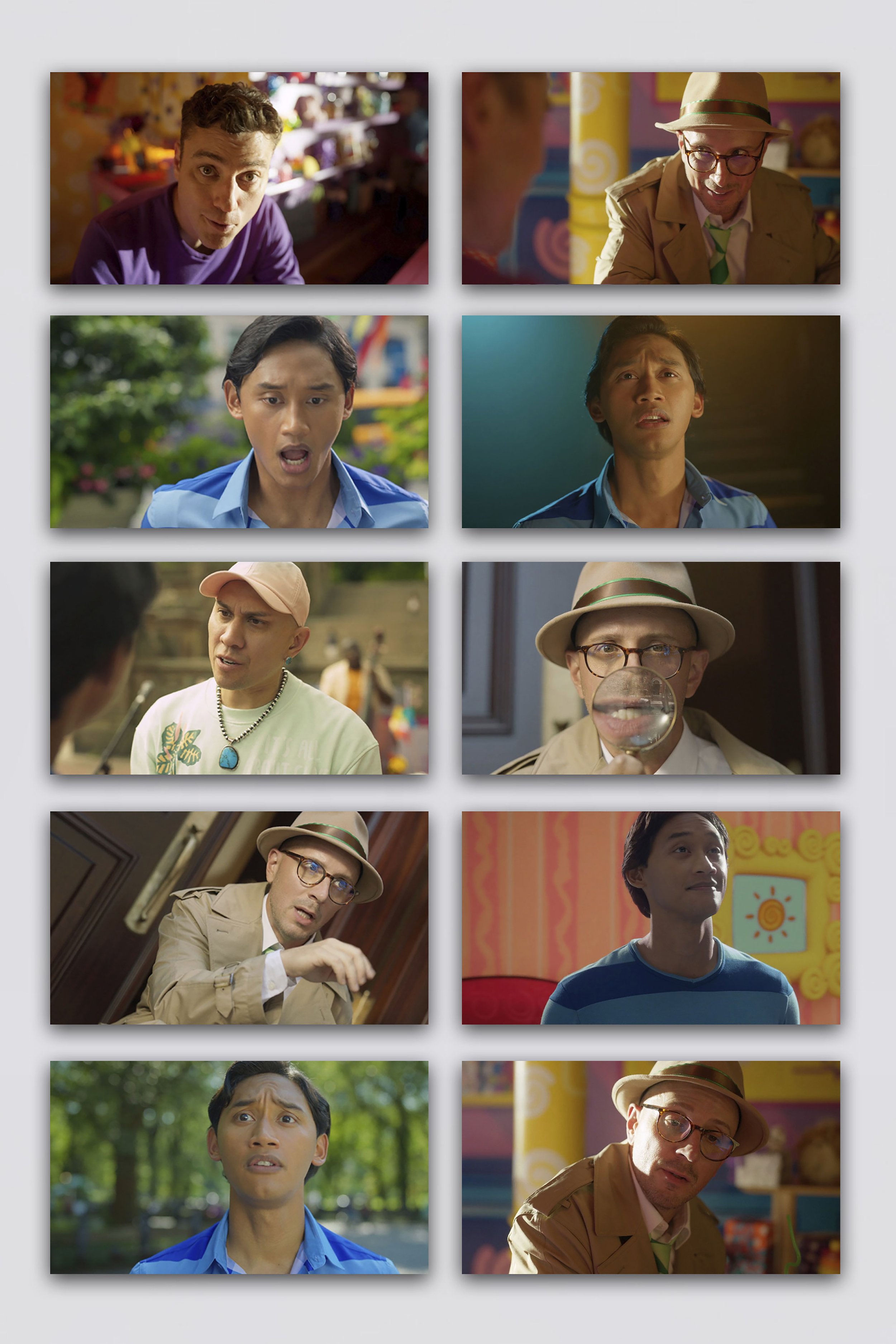 Episodic stills with inconsistent color and quality, many tightly cropped with no room for logos or branding, requiring normalization and spatial rebuild for platform use.